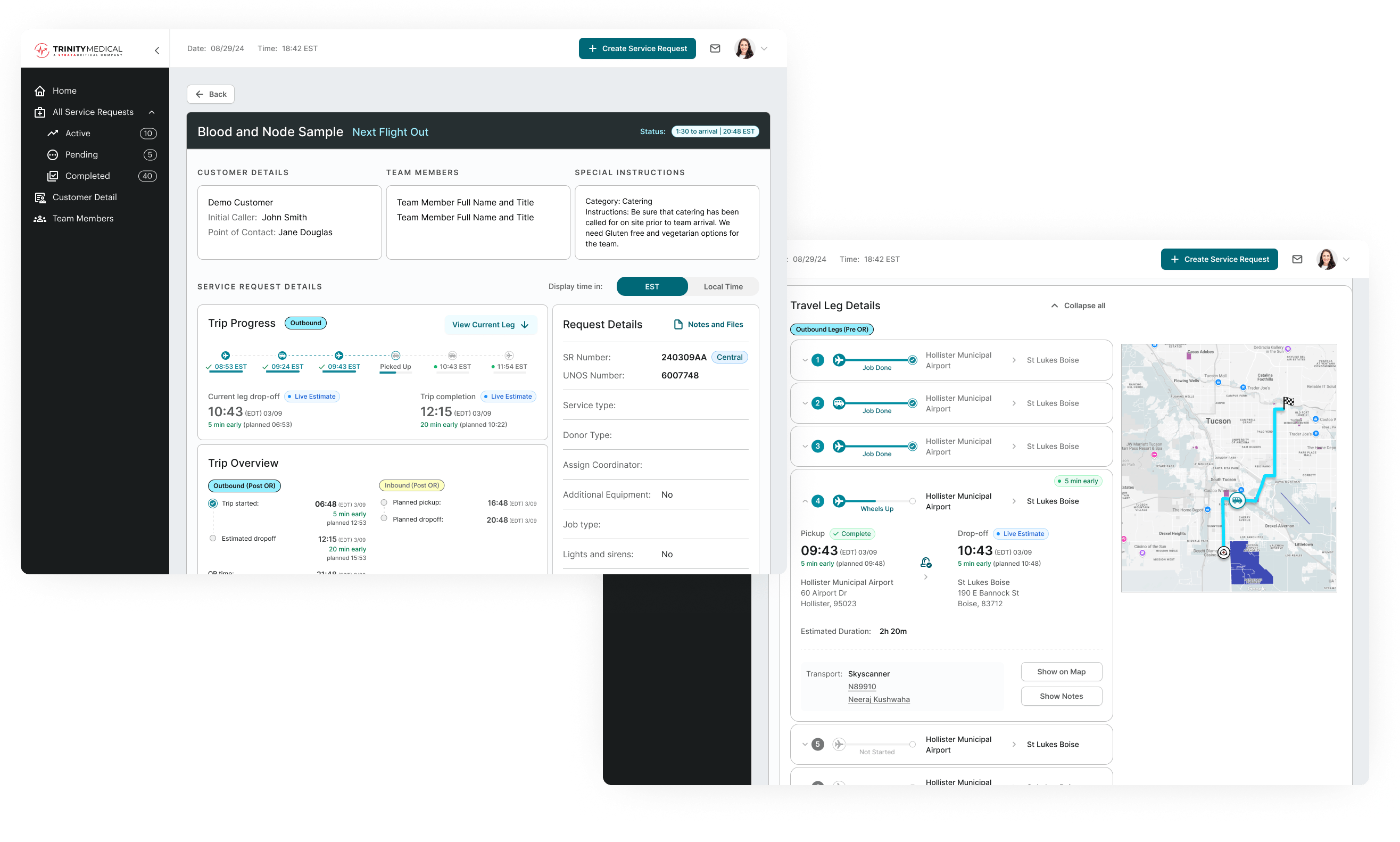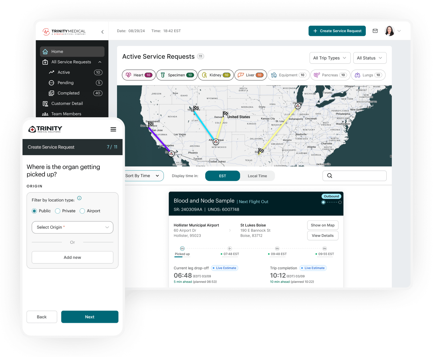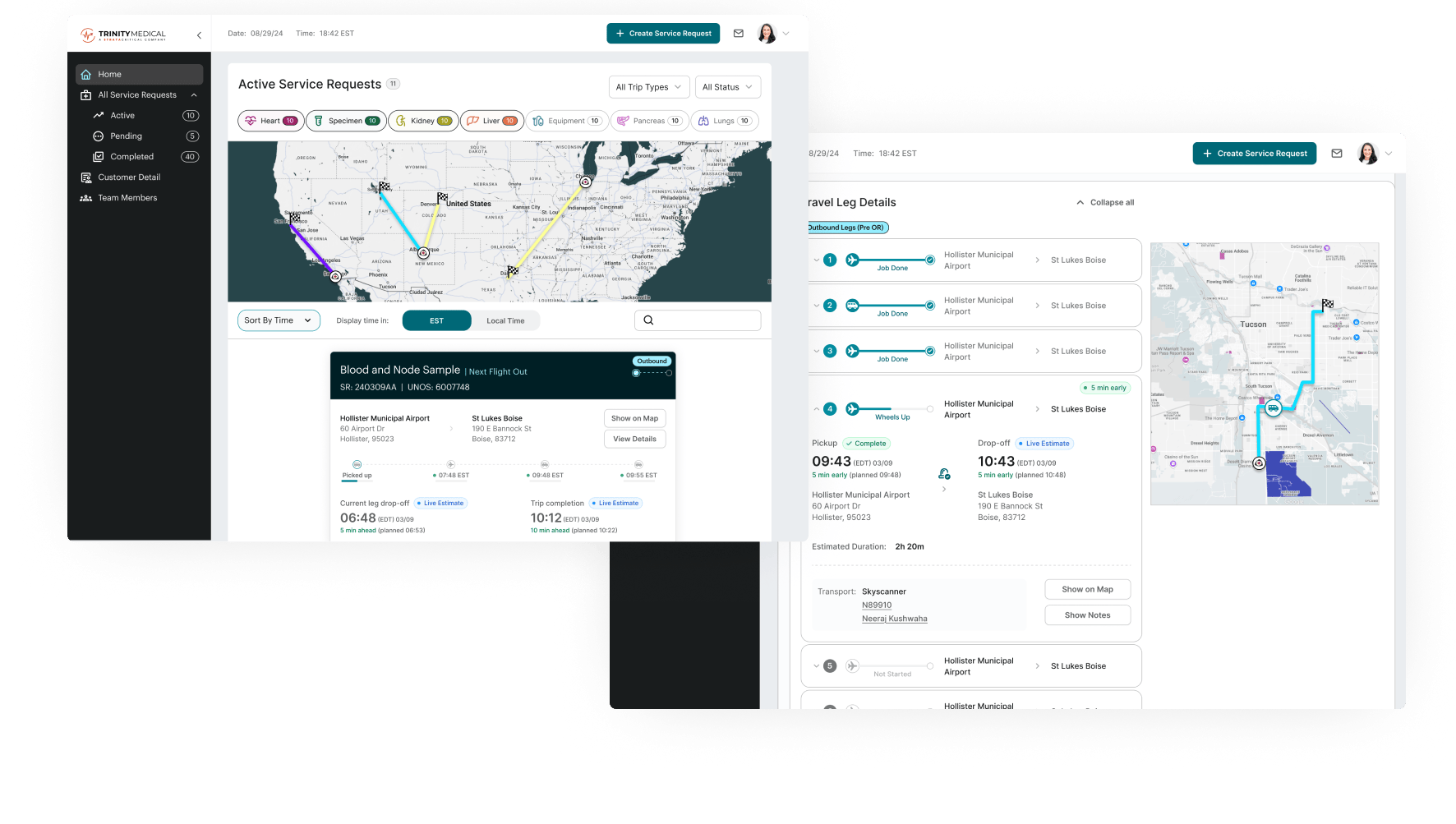 I designed the customer-facing dashboard for Trinity's organ transport logistics platform, enabling transplant coordinators to submit and track time-critical organ transports without relying on phone calls, eliminating manual data entry errors, and providing real-time visibility for hospitals and administrators managing multiple active cases simultaneously.